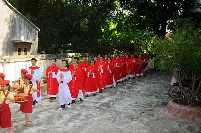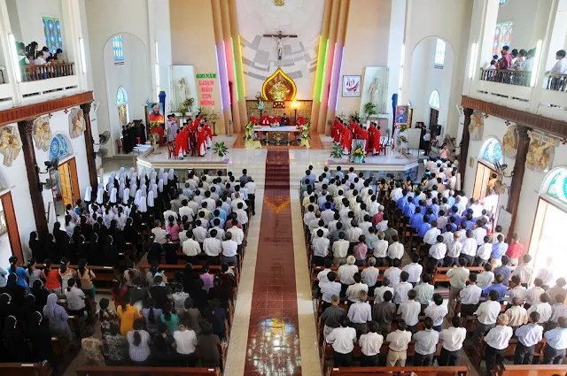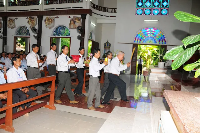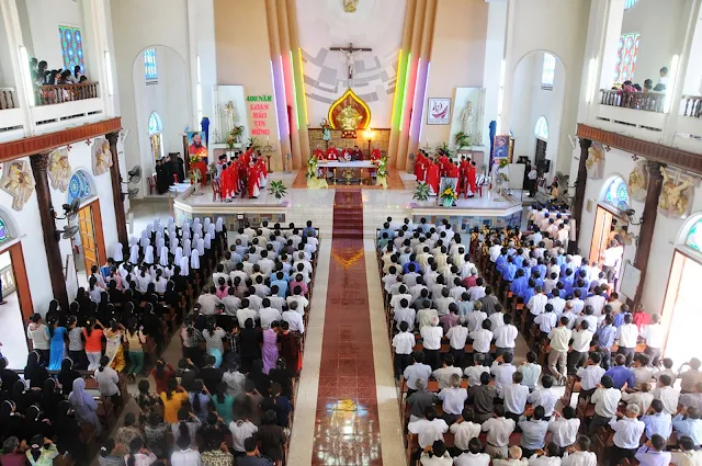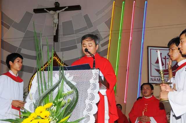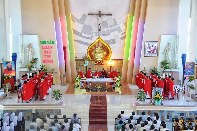 Đúng 9 giờ thánh lễ bắt đầu do cha Tổng đại diện Phêrô Hoàng Kym chủ sự. Cùng đồng tế và tham dự thánh lễ hôm nay có cha hạt trưởng Bình định, quý cha trong giáo phận, đông đảo các nam nữ tu sĩ, chủng sinh và anh chị em giáo dân. Đặc biệt trong thánh lễ hôm nay có sự tham dự của hơn 200 chức việc, giáo dân trong giáo phận đang tham dự khóa huấn luyện thường niên tại chủng viện Quy nhơn.