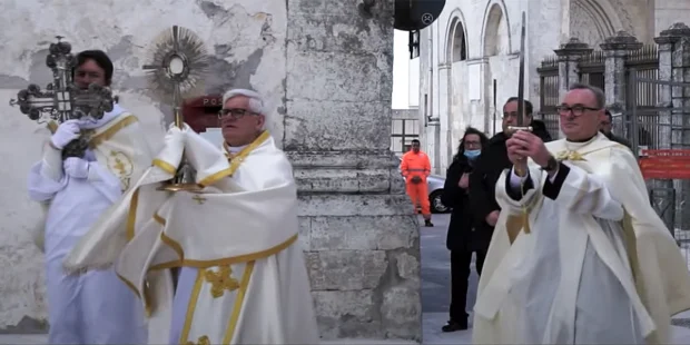 Sáng Chúa nhật lễ lá, thị trấn Gargano của nước Ý đã khẩn cầu sự trợ giúp của Tổng lãnh Thiên Thần Micae để chống lại dịch bệnh Corona. Một đoàn rước gồm các linh mục và giáo dân, mang theo thanh gươm của vị Tổng lãnh Thiên Thần Micae.